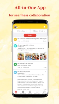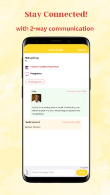 Parent-Teacher communication: You can send requests or queries to the teacher through the app and attach photos, voice messages or documents if needed. For example, if you are running late in the office and need to send someone else to pick up your kid, you don’t have to worry about the visitor’s ID card. You can send the information to the teacher directly in the app and attach their photo. You’ll be notified as soon as the teacher replies.