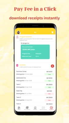 Fee Invoices: You can view the total fee and all the fee bills that are paid and due. The app reminds you closer to the due date so you never miss the payments on time and avoid late fee penalties. You can pay fees through the app using any payment mode and instantly get the fee receipts.