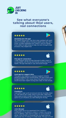Please remember, Just Check In. Download Just Checking In now and feel supported. Read our terms and conditions and privacy policy for more information. Let's prioritize mental health and stay connected. #JustCheckingIn